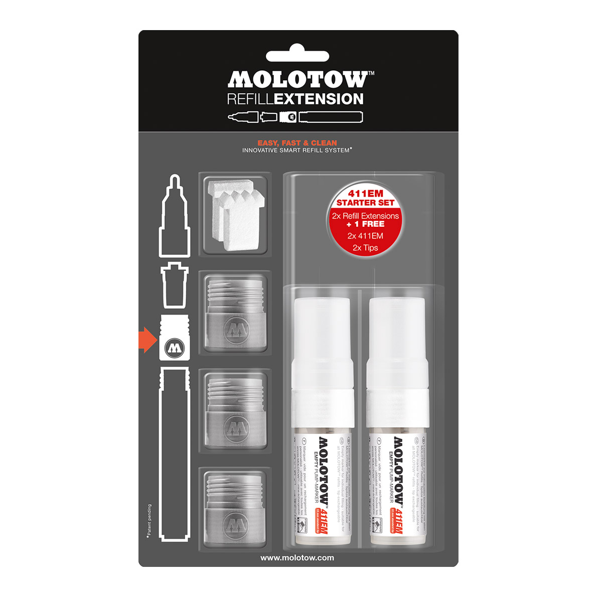 The idea of the new Molotow Refill Extension ring has totally revolutionized the refill technology of our pump markers. Never again greasy hands and even the mixing of new color shades becomes child’s play. Every Molotow pump marker of the series 100/200/400/600 and 700 can be upgraded with the Molotow Refill Extension ring now. At a time where raw materials are rare and prices are increasing, the Molotow painting tools, with exchangeable tips and refill function, are not only a cheap solution, but they also guarantee sustainability.
