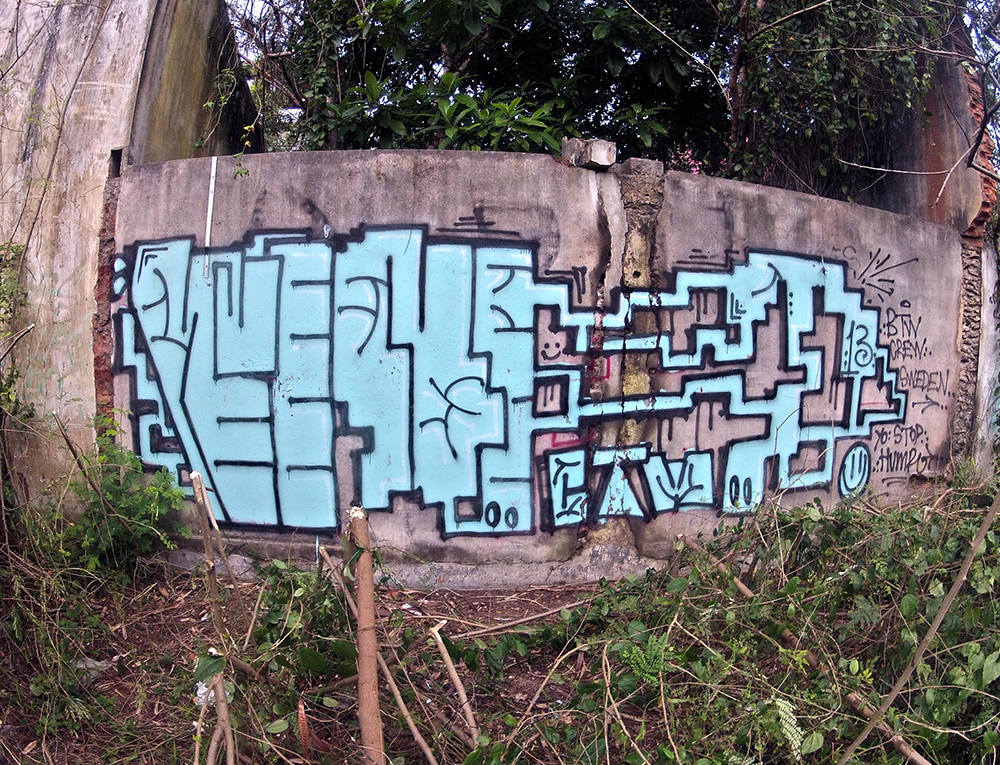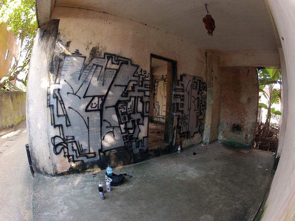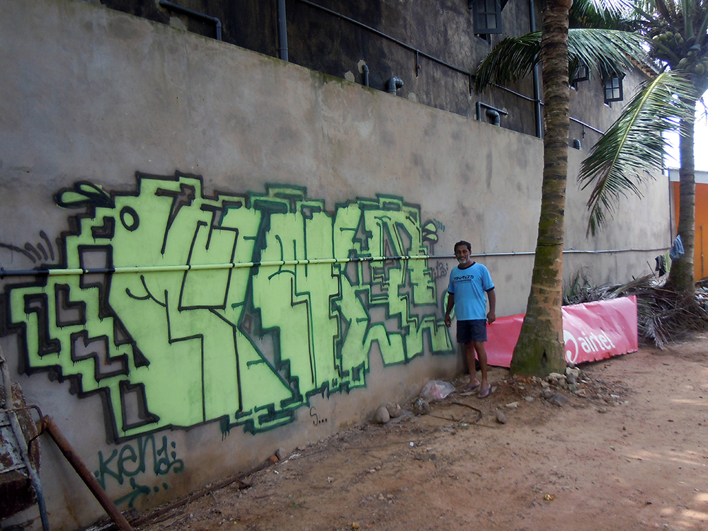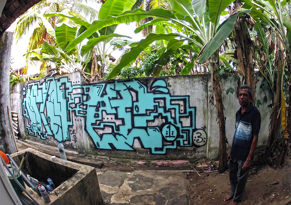 I started my trip in Hikkaduwa, Sri Lanka, quite touristy so I pulled down along the coast to places like as Mirrissa, Galle and Matara, and then a long train journey in the middle of the country to Nuwara Elya. The paint you could find in the closest hardware shop, you could buy a sufficient black for 1 EUR which spurted punky scrubby black paint. Worst paint i have painted with ever but oh so much fun it was, it smelled so disgusting that I thought my brain would poor out through my ears. The graff scene is really poor there! Nothing on the walls, it was basically just my own stuff that I saw when I came back opposite way. The inspiration you found among the wild, the humans and the culture.